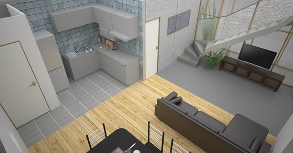 On the ground floor, in order to increase dining/living space, the entrance lobby and kitchen space were redesigned. In the new layout, the main entrance was moved to the North East corner, the kitchen was made without any partition and it was put next to the machine room. As a result, the new ground floor planning has significantly larger dining/living area, yet same size kitchen as in the second design option.