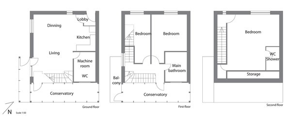 Following client request, second floor became almost completely occupied by the master bedroom with much smaller storage spaces. In addition to that, small bathroom space with shower facility was introduced on the South East corner of the bedroom.